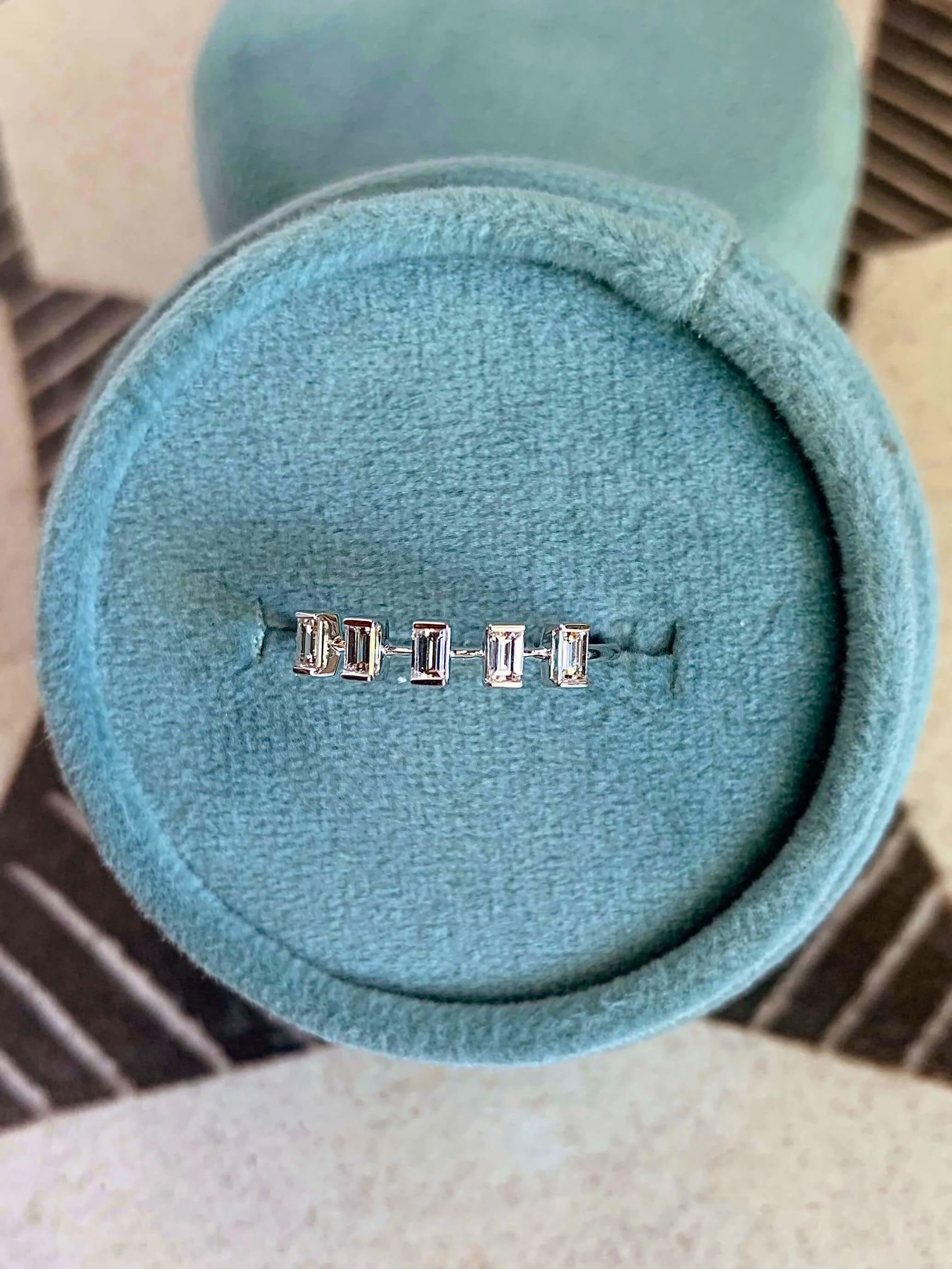 18k white gold ring with 3x3.5mm .32ct diamond baguettes. Band is 1mm. Ring is currently a size 6.25 and can be sized up or down two sizes. Sizing takes 1-2 weeks. Please note size at checkout.